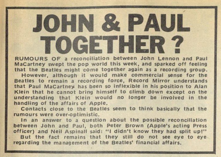 The same day, Record Mirror published the following article mentioning rumours of reconciliation between John Lennon and Paul McCartney.