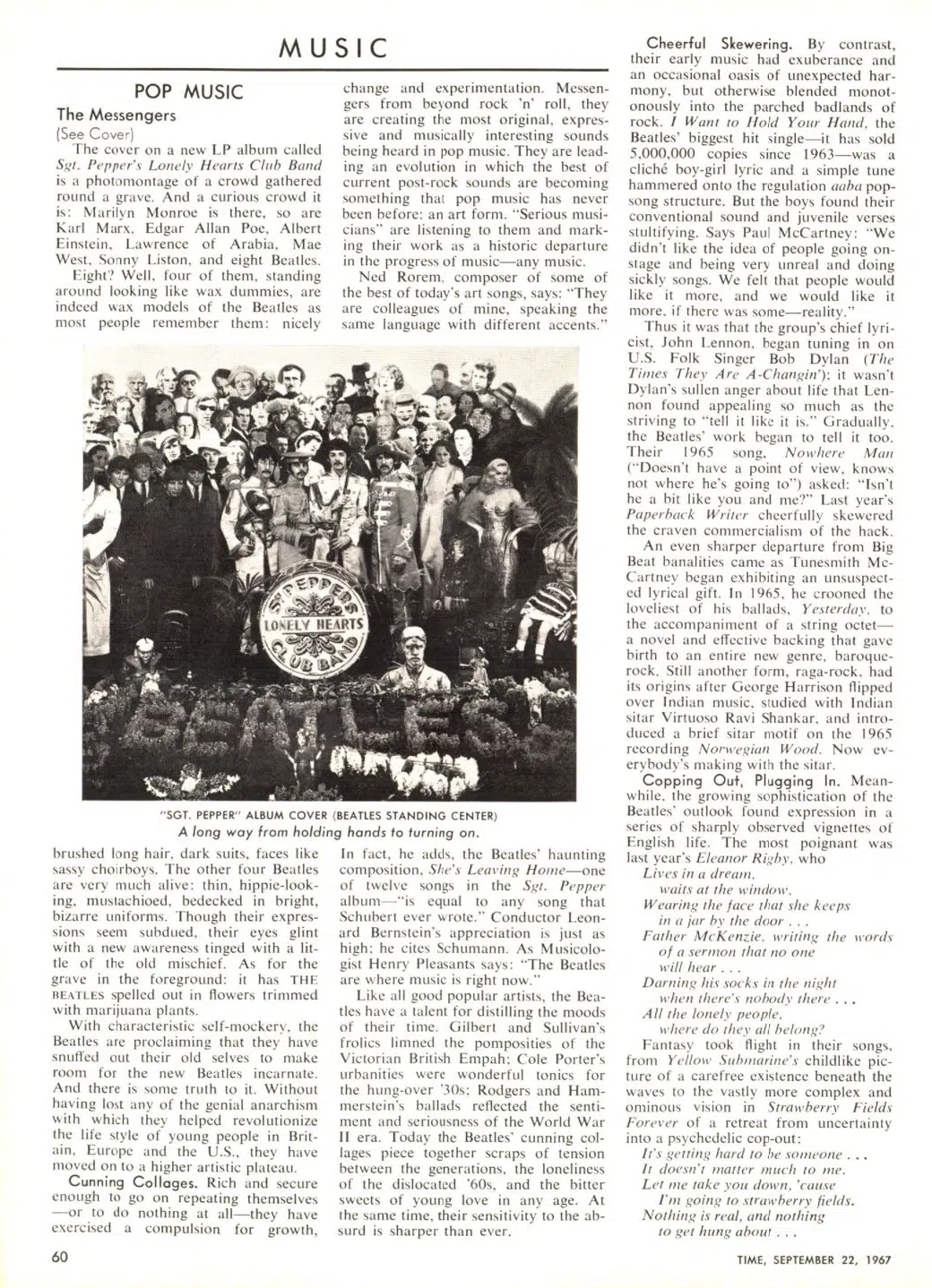 The cover on a new LP album called Sgt. Pepper’s Lonely Hearts Club Band is a photomontage of a crowd gathered round a grave. And a curious crowd it is: Marilvn Monroe is there, so are Karl Marx, Edgar Allan Poe, Albert Einstein, Lawrence of Arabia, Mae West, Sonny Liston, and eight Beatles.