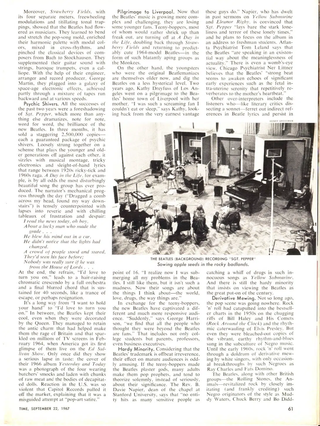 Pilgrimage to Liverpool. Now that the Beatles’ music is growing more complex and challenging, they are losing some younger fans. Teeny-boppers, most of whom would rather shriek up than freak out, are turning off at A Day in the Life, doubling back through Strawberry Fields and returning to predictably cute 1964-model Beatles — in the form of such blatantly aping groups as the Monkees.