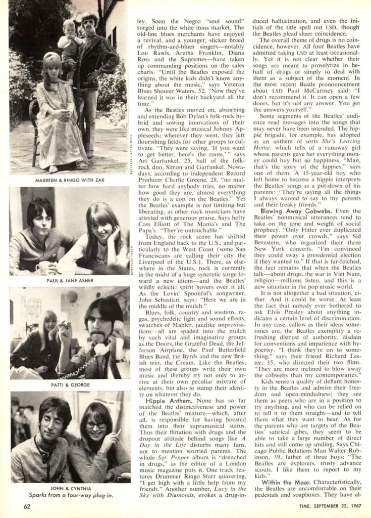 Hippie Anthem. None has so far matched the distinctiveness and power of the Beatles’ mixture — which, after all, is responsible for having boosted them into their supramusical status. Thus their flirtation with drugs and the dropout attitude behind songs like A Day in the Life disturbs many fans, not to mention worried parents. The whole Sgt. Pepper album is “drenched in drugs,” as the editor of a London music magazine puts it. One track features Drummer Ringo Starr quavering, “I get high with a little help from my friends.” Another number. Lucy in the Sky with Diamonds, evokes a drug-induced hallucination, and even the initials of the title spell out LSD, though the Beatles plead sheer coincidence.
