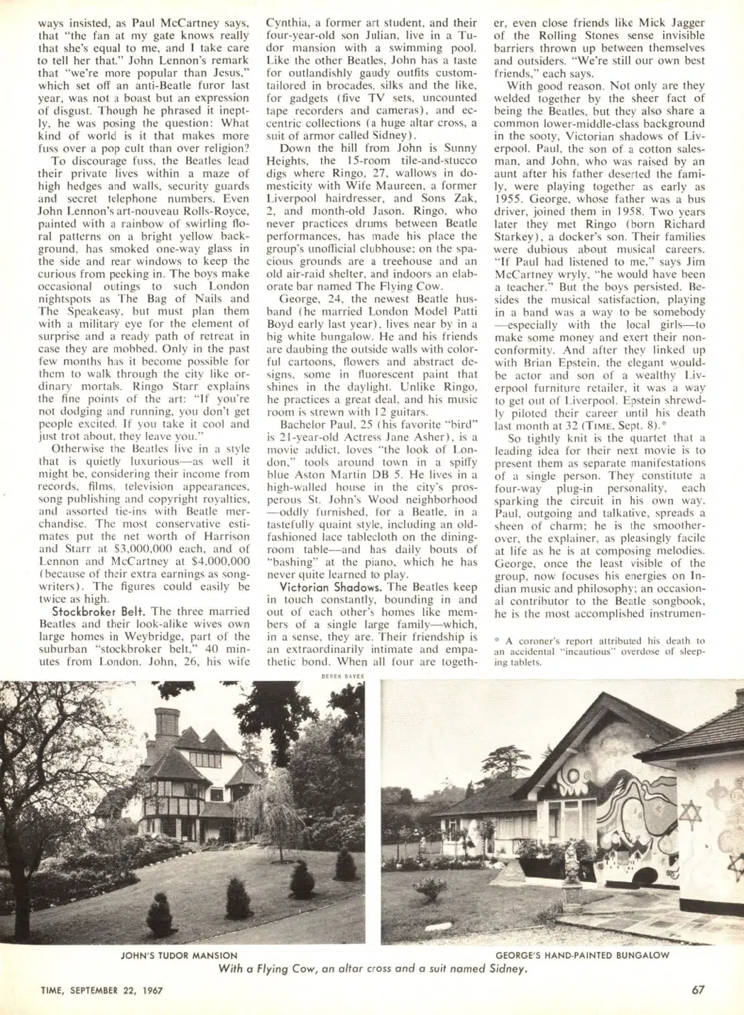 Down the hill from John is Sunny Heights, the 15-room tile-and-stucco digs where Ringo, 27, wallows in domesticity with Wife Maureen, a former Liverpool hairdresser, and Sons Zak, 2, and month-old Jason. Ringo, who never practices drums between Beatle performances, has made his place the group’s unofficial clubhouse: on the spacious grounds are a treehouse and an old air-raid shelter, and indoors an elaborate bar named The Flying Cow.