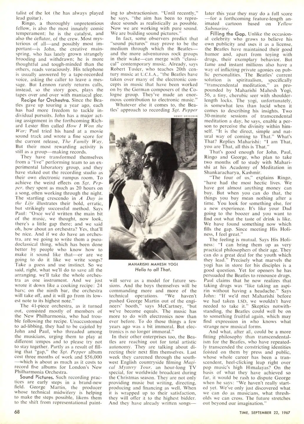 Filling the Gap. Unlike the occasional celebrity who grows to believe his own publicity and uses it as a license, the Beatles have maintained their good humor and, apart from toying with drugs, their exemplary behavior. But fame and instant millions also have a way of inflicting private agonies on public personalities. The Beatles’ current solution is spiritualism, specifically “transcendental meditation,” as propounded by Maharishi Mahesh Yogi, 56, a tiny, cherubic seer with shoulder-length locks. The yogi, unfortunately, is somewhat less than lucid when it comes to describing his insights. Two 30-minute sessions of transcendental meditation a day, he says, enable a person to perceive the divinity within himself. “It is the direct, simple and natural way of coming to That.” What’s Thal? Replies Maharishi: “I am That, you are That, all this is That.”