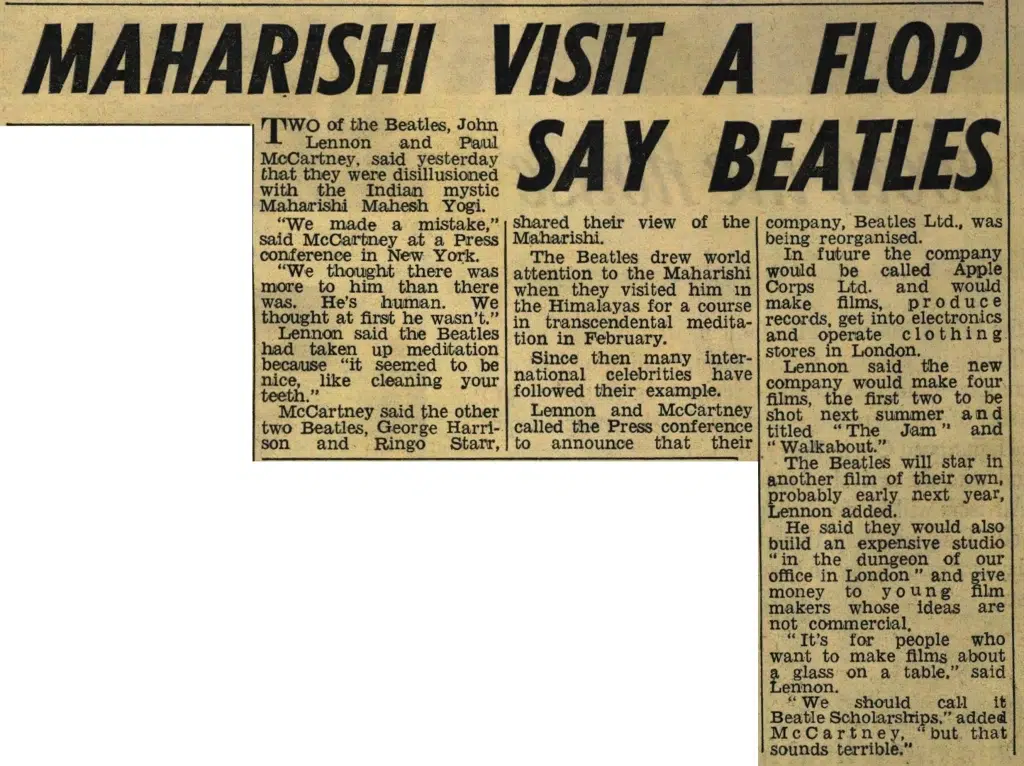 “We made a mistake,” said McCartney at a Press conference in New York. “We thought there was more to him than there was. He’s human. We thought at first he wasn’t.” Lennon said the Beatles had taken up meditation because “it seemed to be nice, like cleaning your teeth.”