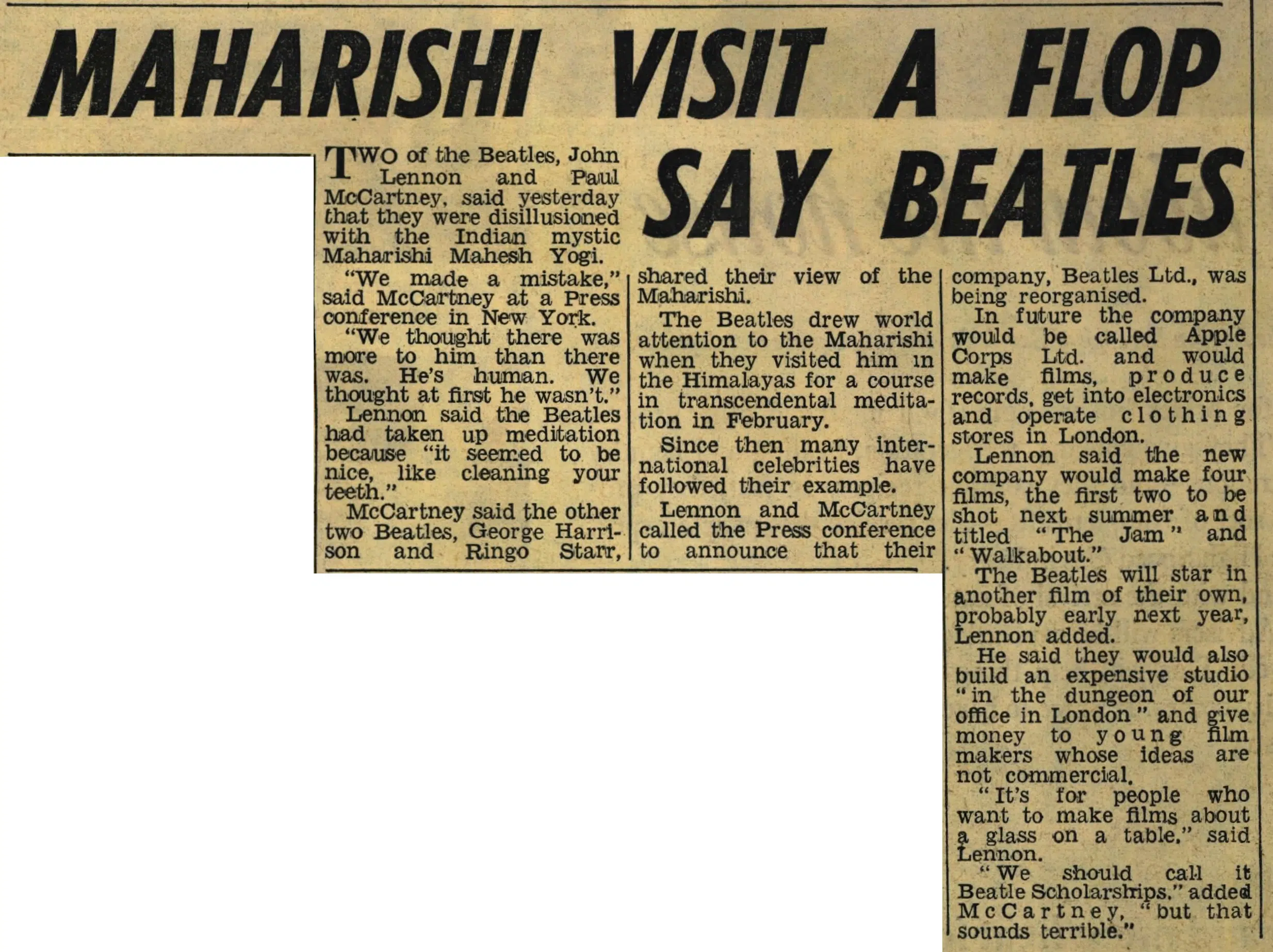 The Beatles drew world attention to the Maharishi when they visited him in the Himalayas for a course in transcendental meditation in February. Since then many international celebrities have followed their example.Lennon and McCartney called the Press conference to announce that their company, Beatles Ltd., was being reorganised. In future the company would be called Apple Corps Ltd. and would make films, produce records, get into electronics and operate clothing stores in London. Lennon said the new company would make four films, the first two to be shot next summer and titled “The Jam” and “Walkabout.”