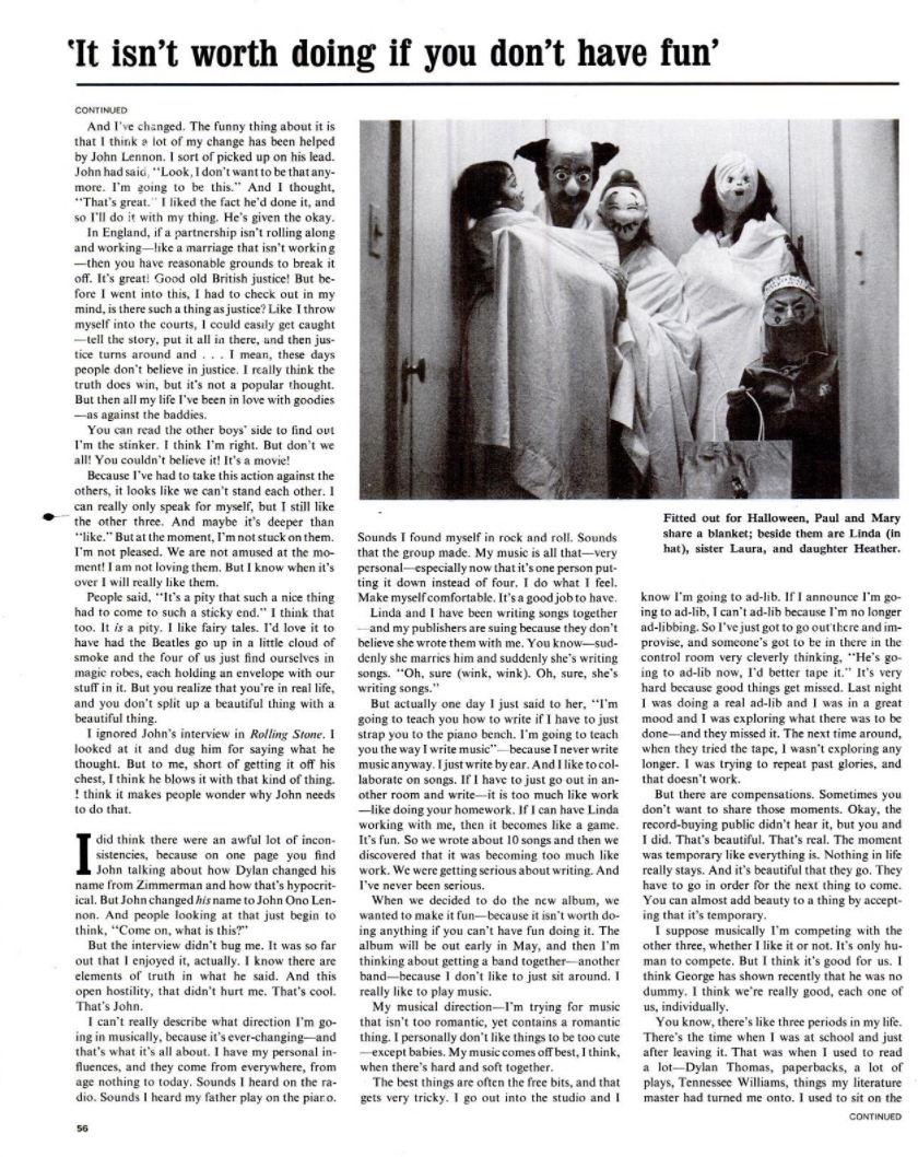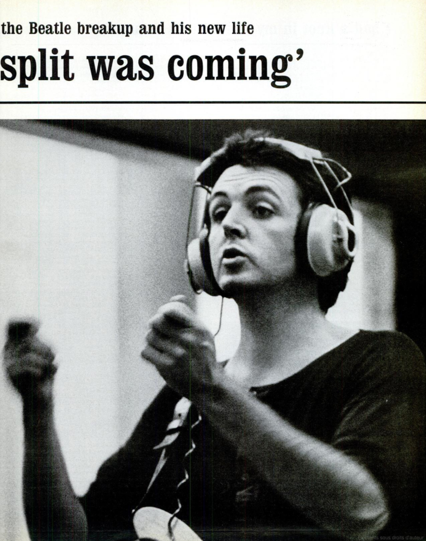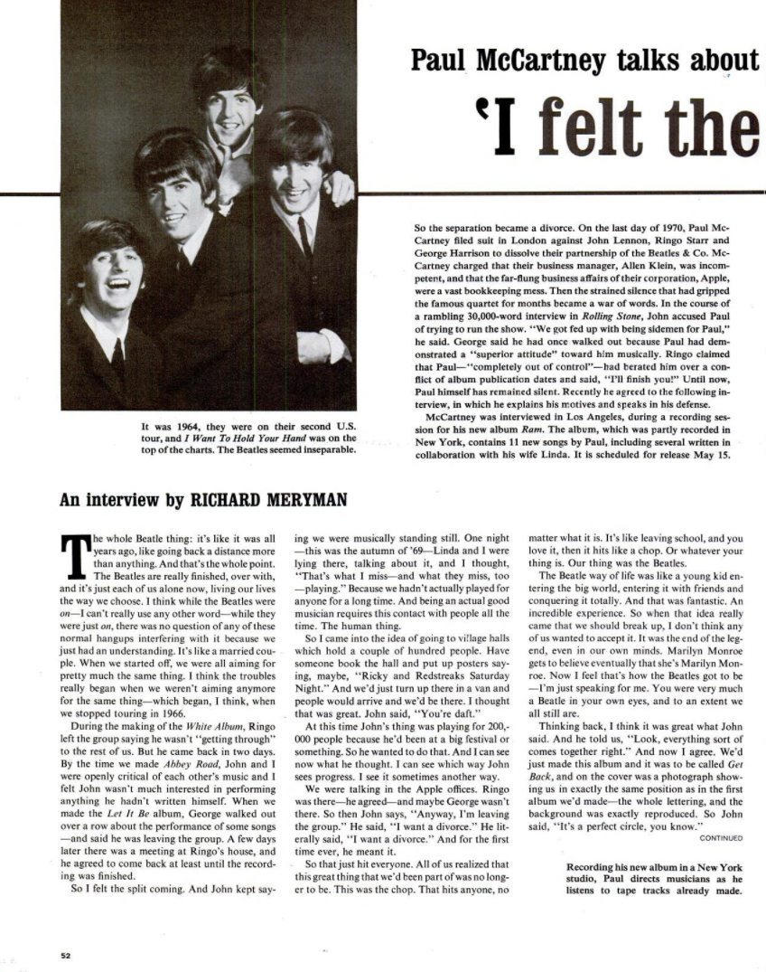 PAUL: “The whole Beatle thing — it’s like it was all years ago — like going back a distance more than anything. And that’s the whole point. The Beatles are really finished, over with, and it’s just each of us alone now, living our lives the way we choose. I think while the Beatles were on — I can’t really use any other word — while they were just on, there was no question of any of these normal hangups interfering with it because we just had an understanding. It’s like a married couple. When we started off we were all aiming for pretty much the same thing. I think the troubles really began when we weren’t aiming anymore for the same thing, which began, I think, when we stopped touring in 1966. During the making of the White Album, Ringo left the group saying he wasn’t ‘getting through’ to the rest of us. But he came back in two days. By the time we made Abbey Road, John and I were openly critical of each other’s music and I felt John wasn’t much interested in performing anything he hadn’t written himself. When we made the ‘Let It Be’ album, George walked out over a row about the performance of some songs — and said he was leaving the group. A few days later there was a meeting at Ringo’s house, and he agreed to come back at least until the recording was finished.”