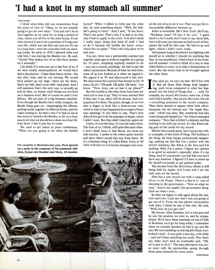 “Maybe that sounds petty, but I can go into other examples of this kind of thing. The build-up is the thing — All these things continuously happening making me feel like I’m a junior with the record company, like Klein is the boss and I’m nothing. Well, I’m a senior. I figure my opinion is as good as anyone’s, especially when it’s my thing. And it’s emotional. You feel like you don’t have any freedom. I figured I’d have to stand up for myself eventually or get pushed under. The income from the McCartney album is still being held by Apple, and Linda and I are the only ones on the record. John has a new record out with a song called ‘Power to the People.’ There’s a line in it — sort of shouting to the government — ‘Give us what we own.’ And to me Apple’s the government thing. Give me what I own.”