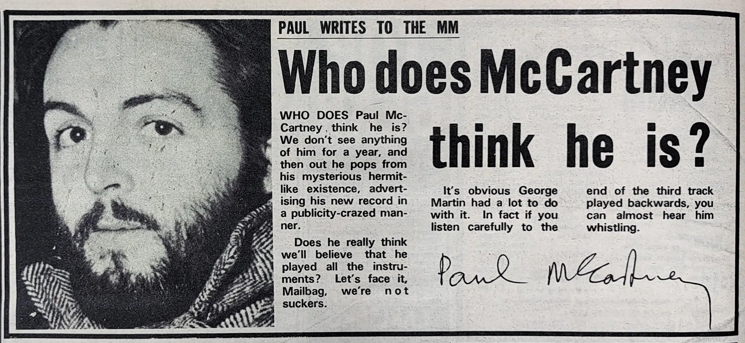 We don’t see anything of him for a year, and then out he pops from his mysterious hermit like existence, advertising his new record in a publicity-crazed manner. Does he really think we’ll believe he played all the instruments? Let’s face it Mailbag, we’re not suckers. It’s obvious George Martin had a lot to do with it. In fact, if you listen carefully to the end of the third track played backwards, you can almost hear him whistling.