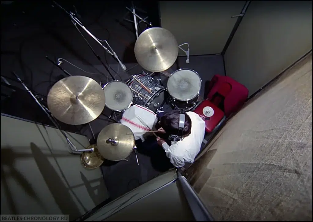 The overdub process started after the camera crew left (and a dinner break). Paul overdubbed his bass guitar, joined by George on a distorted guitar and additional off-beat drums from Ringo. John and Paul then added their double-tracked vocals, and Paul finished it up by adding a single-tracking backing vocal.