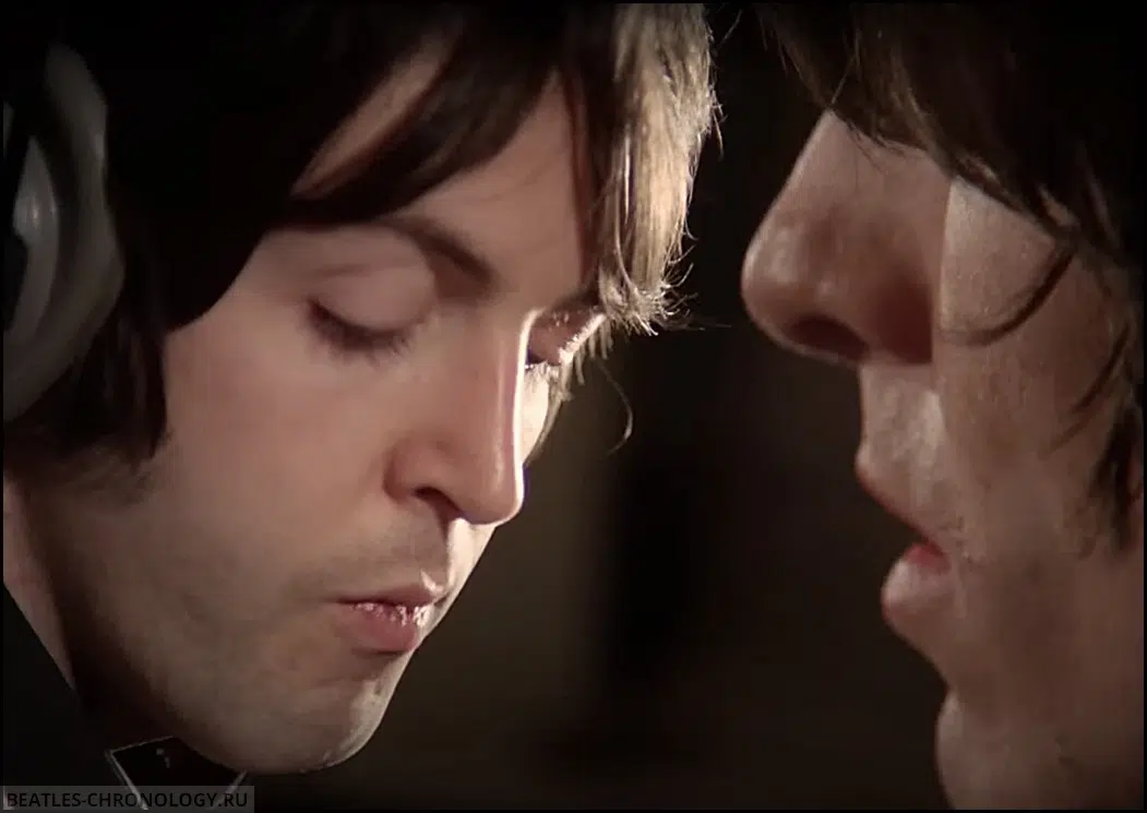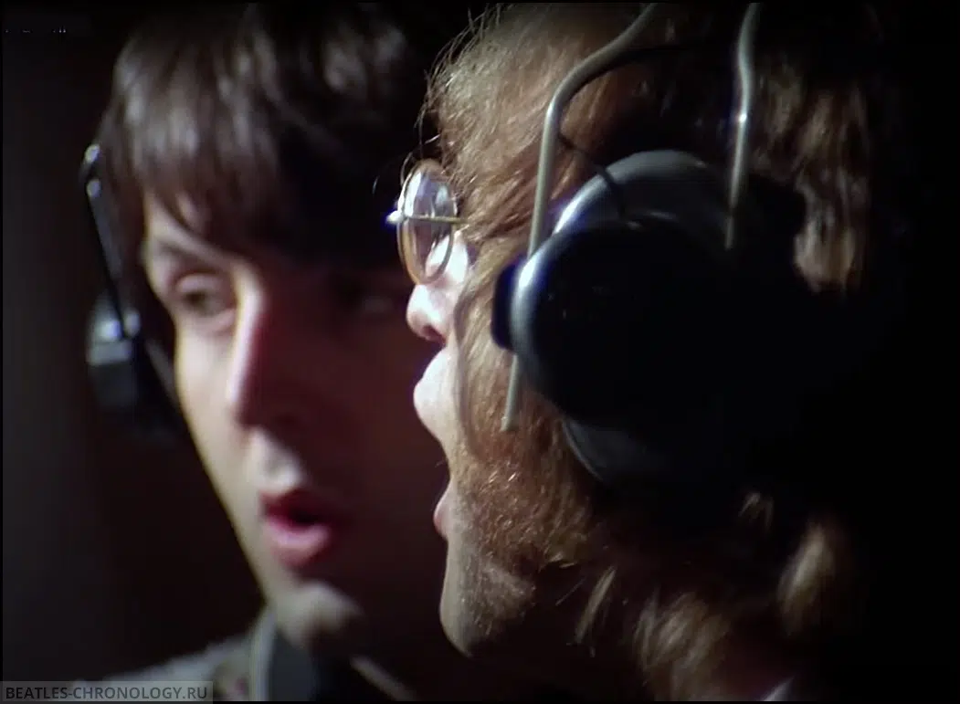 The overdub process started after the camera crew left (and a dinner break). Paul overdubbed his bass guitar, joined by George on a distorted guitar and additional off-beat drums from Ringo. John and Paul then added their double-tracked vocals, and Paul finished it up by adding a single-tracking backing vocal.