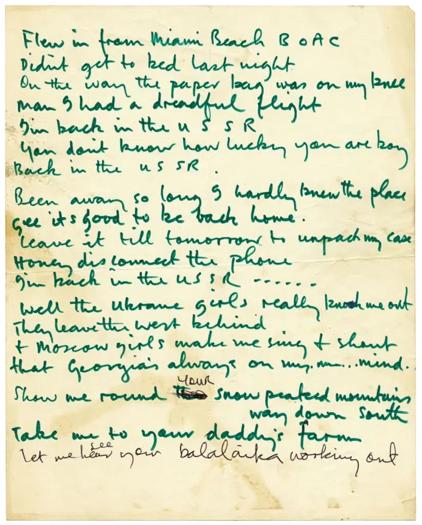 Released six months after the Warsaw Pact’s invasion of Czechoslovakia, the normalized portrayal of the USSR prompted condemnation in the West from both the New Left and the political right. In 1976, backed by “Twist and Shout“, it was issued as a single to promote the compilation album Rock ‘n’ Roll Music. It peaked at number 19 on the UK Singles Chart and number 11 in Ireland. In 2003, McCartney performed the song in Moscow’s Red Square. Elton John and Billy Joel have also released versions recorded during concerts in Russia.