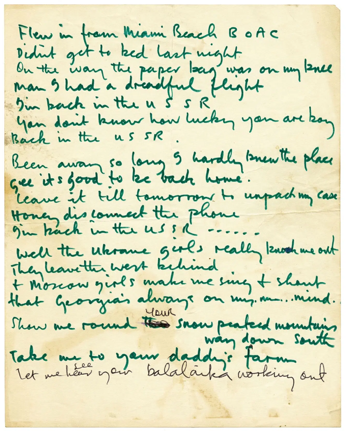 One way or another, the Russian ‘protagonist’ of this song has certainly been influenced by The Beach Boys, and Chuck Berry’s ‘Back in the U.S.A.’ is in there too. And it’s perfectly in order for him to have been influenced by The Beach Boys. He’s on a plane from Miami, after all, where he’s been listening to ‘California Girls’ in particular, which is why our bridge section refers to how the ‘Ukraine girls really knock me out’. There’s a pretty blatant parody of a Beach Boys chorus in the background.