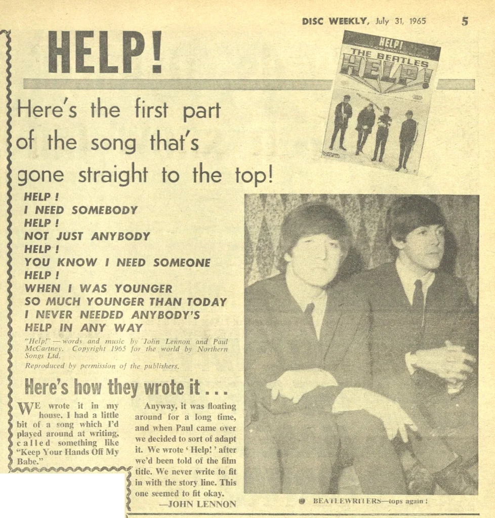 “Help!” was written by John Lennon and credited to Lennon–McCartney. During an interview with Playboy in 1980, Lennon recounted: “The whole Beatles thing was just beyond comprehension. I was subconsciously crying out for help“.
