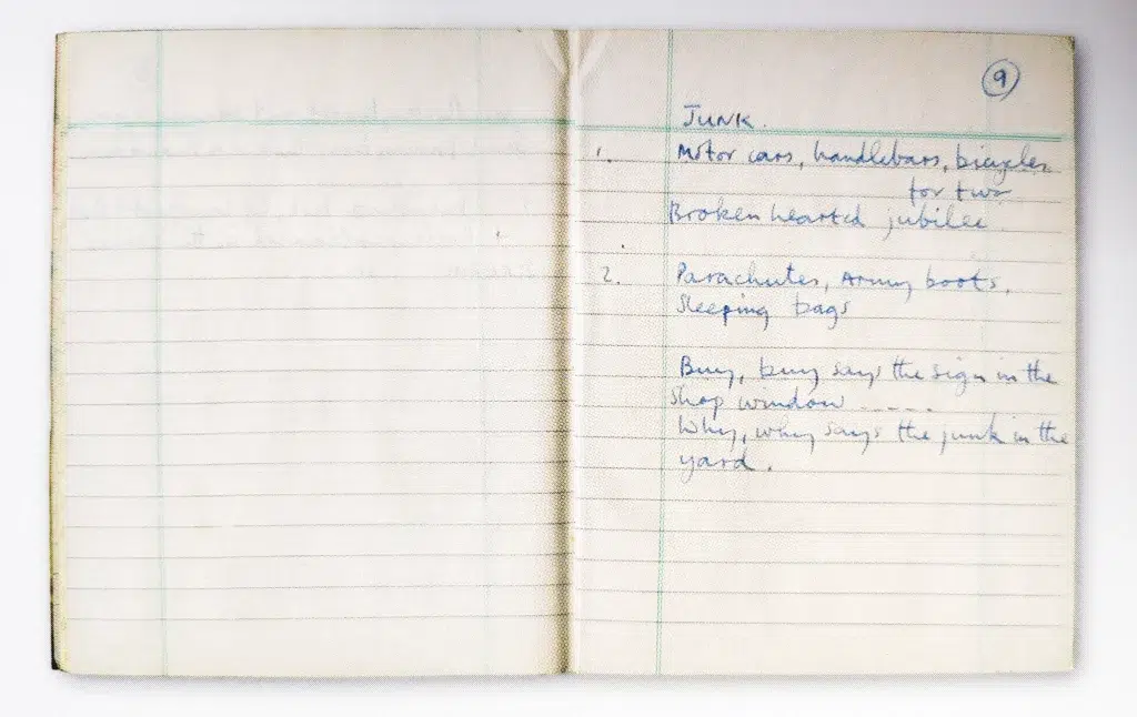 Linda was very helpful, because she used to say, ‘I love to hear you play the guitar’. I was no longer sitting in a room on my own, like I used to be. So I’ll strum along when I watch telly. ‘Junk’ came along that way. Handlebars, sentimental jubilee, jam jars: I like images like that. There are certain words you like. I always used to say that candlestick was my favourite word. Certain words either make colours in your head or bring up a feeling. So the song was a pot-pourri of nice words that I had to make some sense out of, so it was ‘buy buy, sell sell, Junk says the sign in the yard’. To lump it all together I got the idea of ‘Junk’. It was a nice way to write a song. There was also the ‘Singalong’ instrumental version, influenced by Phil Spector’s technique of taking off the lyric for a B-side and calling it ‘Singalong’.