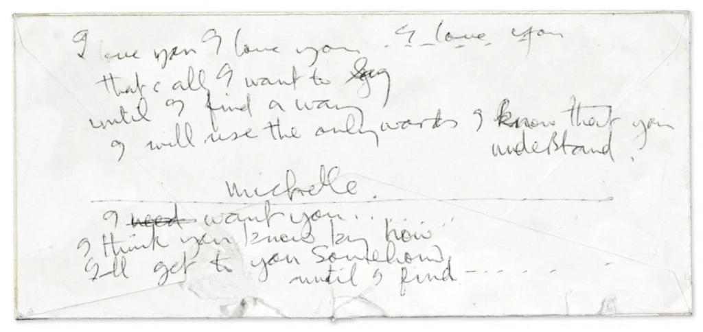 Vaughan came up with “Michelle, ma belle”, and a few days later McCartney asked for a translation of “these are words that go together well”, rendered, for scansion, as sont des mots qui vont très bien ensemble (“are words that go very well together”). When McCartney played the song for Lennon, Lennon suggested the “I love you” bridge. Lennon was inspired by a song he heard the previous evening, Nina Simone’s version of “I Put a Spell on You”, which used the same phrase but with the emphasis on the last word, “I love you“.