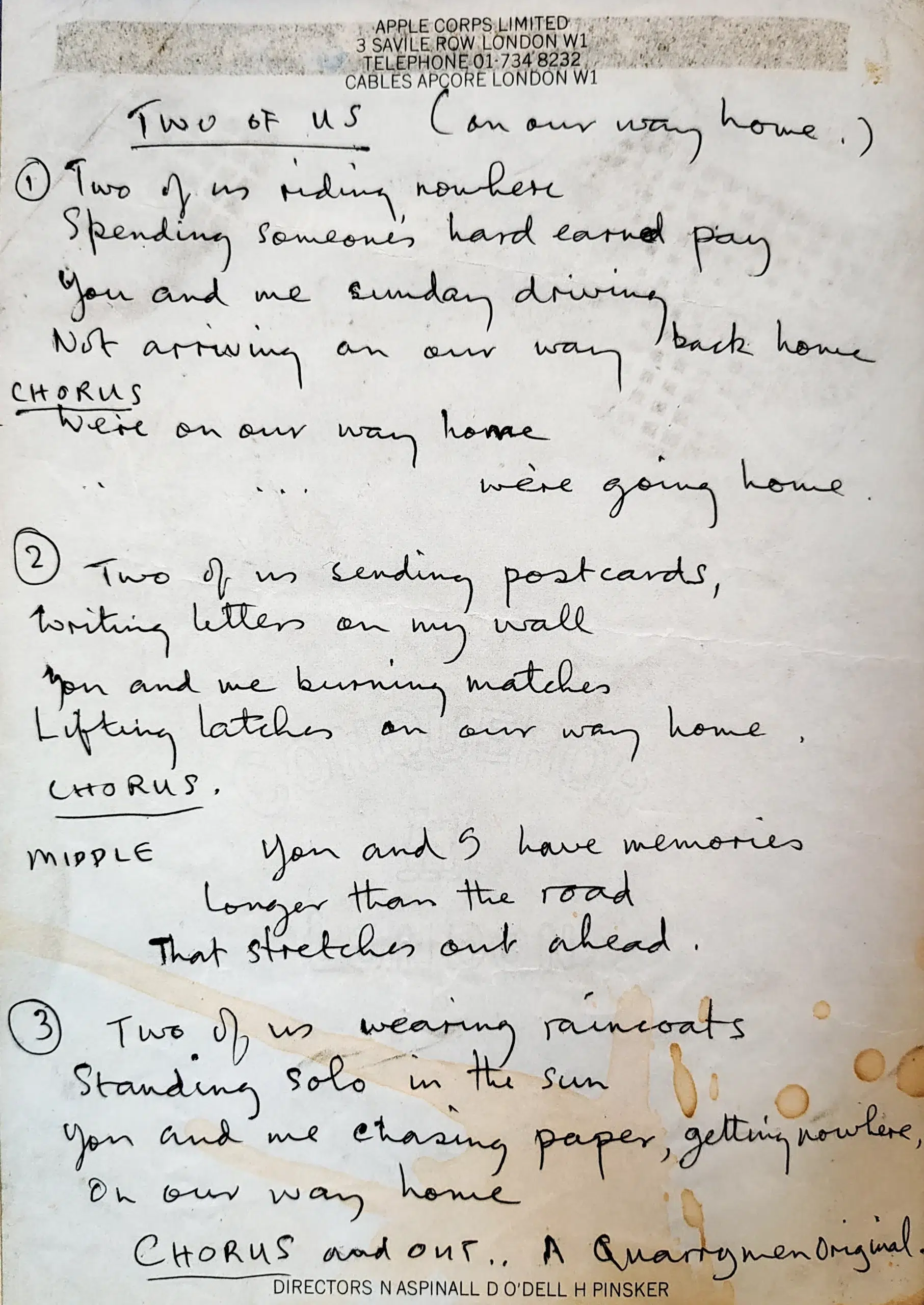The song was originally titled “On Our Way Home”. Ian MacDonald suggested that the lyrics (e.g.: “you and I have memories/longer than the road that stretches out ahead” or “you and me chasing paper/getting nowhere”) sounded like McCartney was probably addressing Lennon and contractual troubles. “You Never Give Me Your Money“, a different composition by McCartney from the previously released album, but recorded after Let It Be, Abbey Road, also refers to the Beatles’ contract with Allen Klein as “funny paper”.