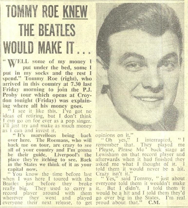 I was at the Newcastle City Hall concert on 23rd March 1963, We were so young and didnt have much money but we could buy half price tickets to sit on the stage. No one really knew who the Beatles were. They'd had a minor hit with Love me Do and just had a number 1 with Please Please Me. The Beatles were on just before the interval and the crowd went wild for them. After the interval Tommy Roe was drowned out by booing and shouting for the Beatles. Chris Montez was so furious he started to strip during 'Lets Dance' bringing an already excited audience of little girls to fever pitch. those of us on the stage attacked him and pulled him off his feet. He was terrified.