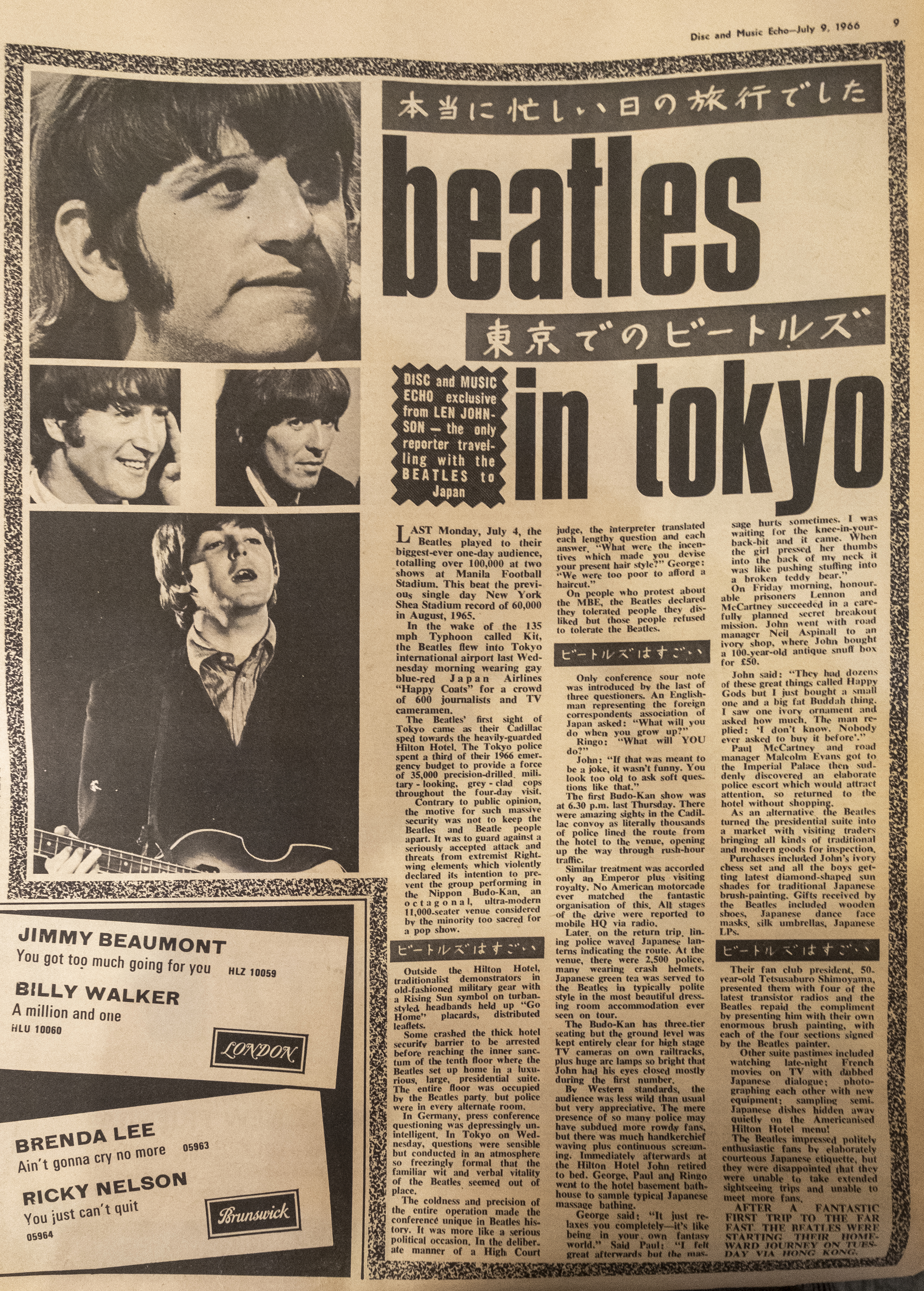 The Beatles experienced a completely different set-up in Japan from any other country they have visited. In the first place, the Japanese authorities considered it their responsibility to look after the boys, and if anything had gone wrong, they would have considered it a great dishonour to themselves. Also the Beatles had heard that Japanese audiences were much wilder, but, in actual fact, they were more restrained, especially while the boys were singing. This might have been due to the fact that the 9,000 audience in the Budo Kan had 3,000 police to look after them!!!